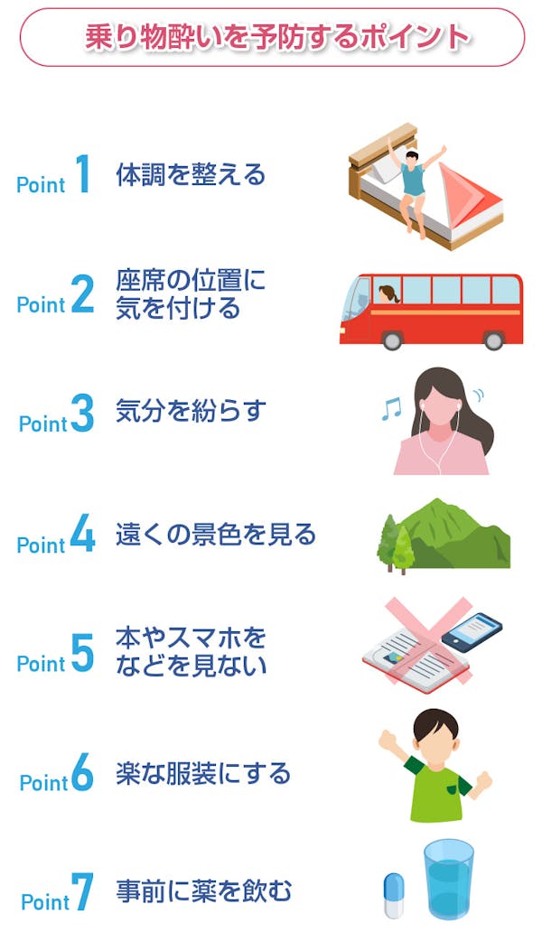 ここでは乗り物酔いを予防するためのポイントを7つご紹介します。