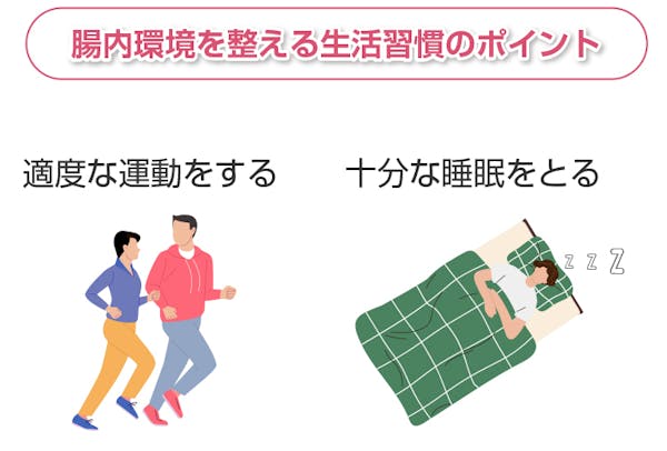 腸内環境を整えるため、食事の他にも適度な運動や十分な睡眠を心掛けましょう。